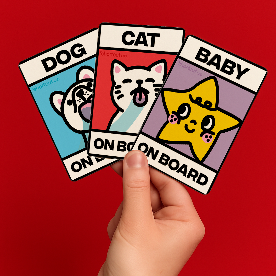 Each On Board sticker is an original Shortcut Lab illustration, drawn with love in Melbourne. Quirky and a little cheeky, they bring character and charm to your car window.