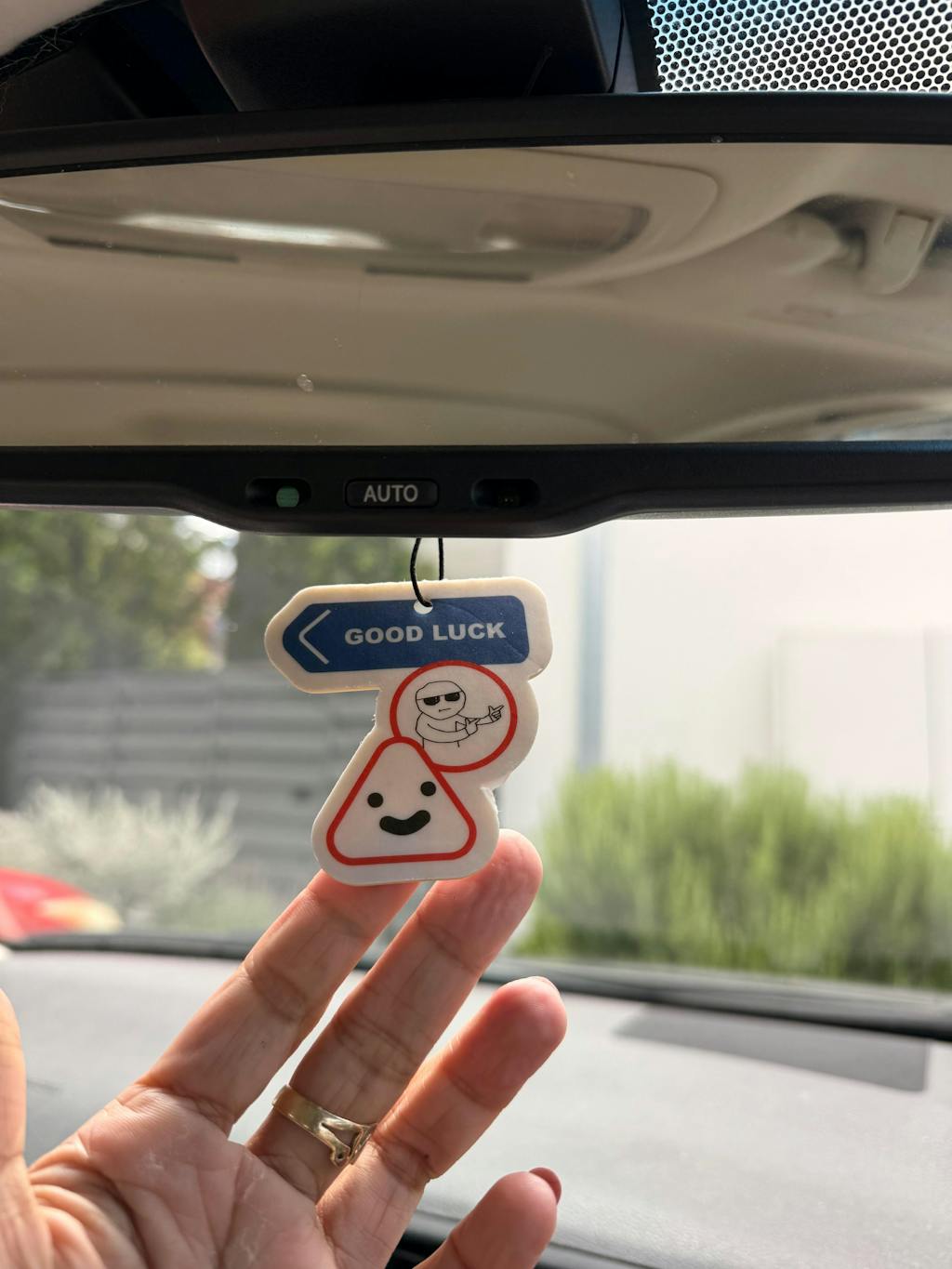 Shortcut Lab ‘Good Luck’ car fragrance card in Ocean scent featuring a blue ‘GOOD LUCK’ sign design with cheerful character illustration, suitable for car, wardrobe, or office.